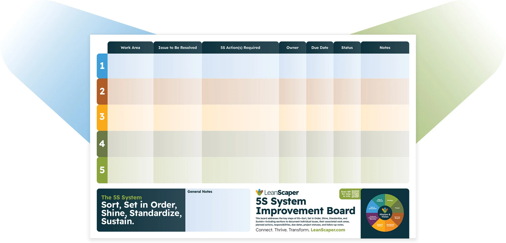This system is built on 5S principles, a Lean methodology proven to streamline operations, reduce downtime, and increase productivity. Whether you’re new to Lean or looking to improve your business processes, this board will guide your team toward lasting improvements.